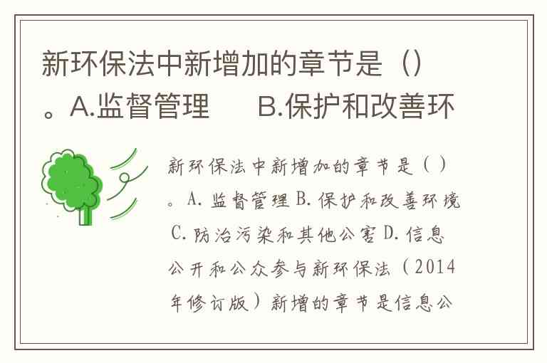 新环保法中新增加的章节是()。A.监督管理 B.保护和改善环境 C.防治污染和其他公害 D.信息公开和公众参与