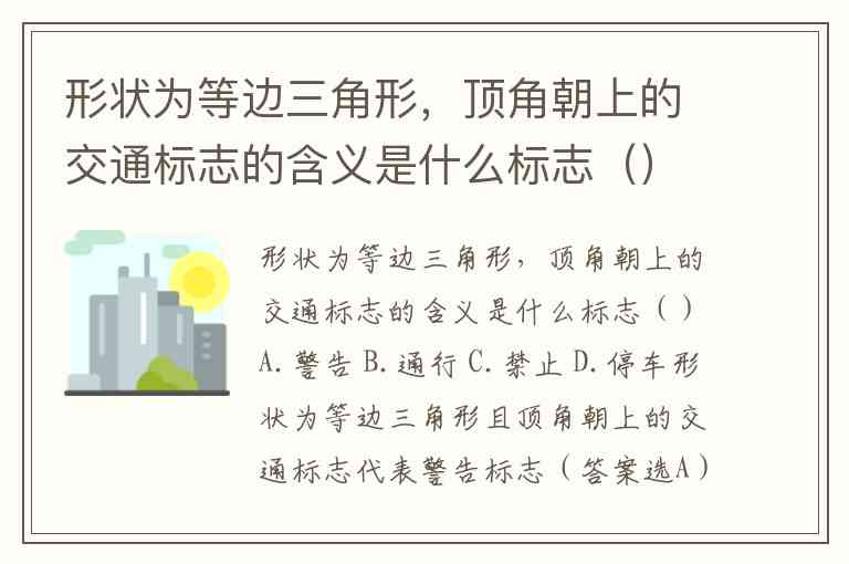 形状为等边三角形,顶角朝上的交通标志的含义是什么标志()A.警告 B.通行 C.禁止 D.停车
