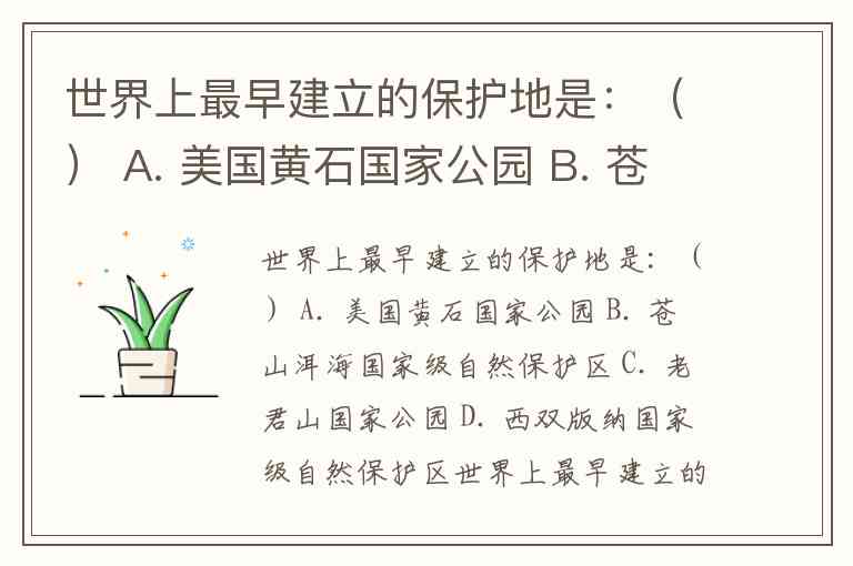 世界上最早建立的保护地是:() A. 美国黄石国家公园 B. 苍山洱海国家级自然保护区 C. 老君山国家公园 D. 西双版纳国家级自然保护区