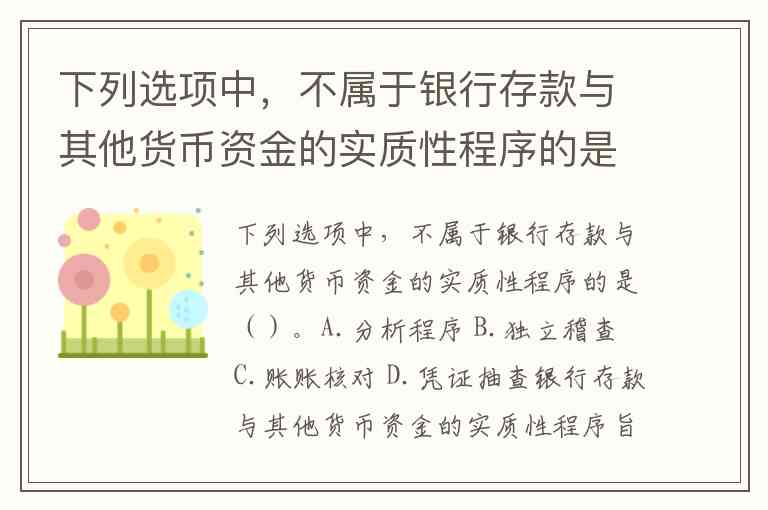 下列选项中,不属于银行存款与其他货币资金的实质性程序的是()。A.分析程序 B.独立稽查 C.账账核对 D.凭证抽查