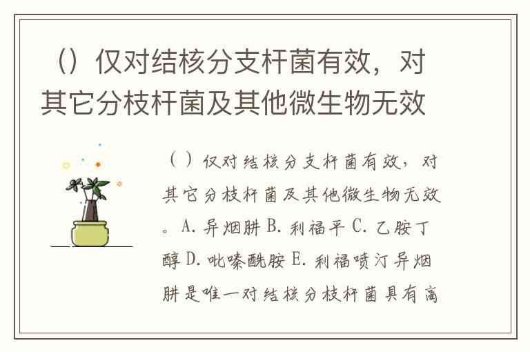 ()仅对结核分支杆菌有效,对其它分枝杆菌及其他微生物无效。A.异烟肼 B.利福平 C.乙胺丁醇 D.吡嗪酰胺 E.利福喷汀