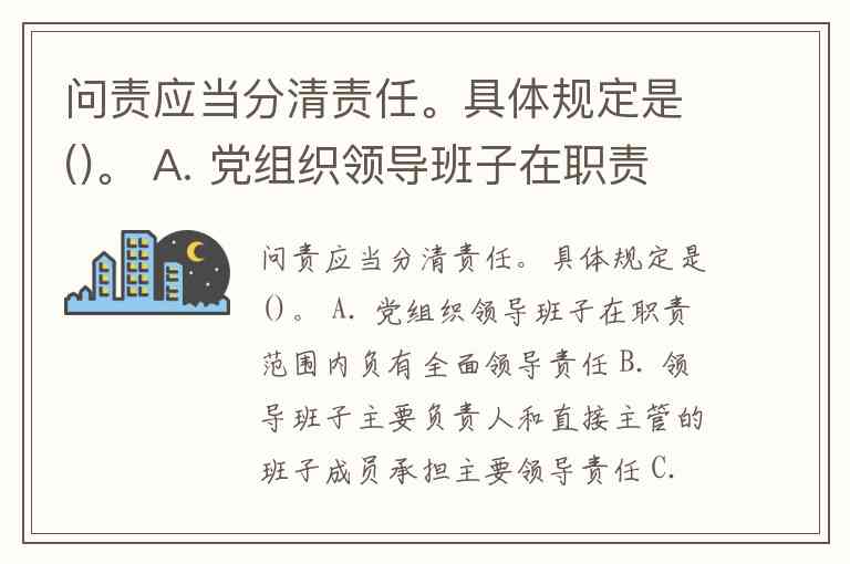 问责应当分清责任。具体规定是()。 A. 党组织领导班子在职责范围内负有全面领导责任 B. 领导班子主要负责人和直接主管的班子成员承担主要领导责任 C. 参与决策和工作的班子其他成员承担重要领导责任 D. 直接主管的班子成员承担重要领导责任
