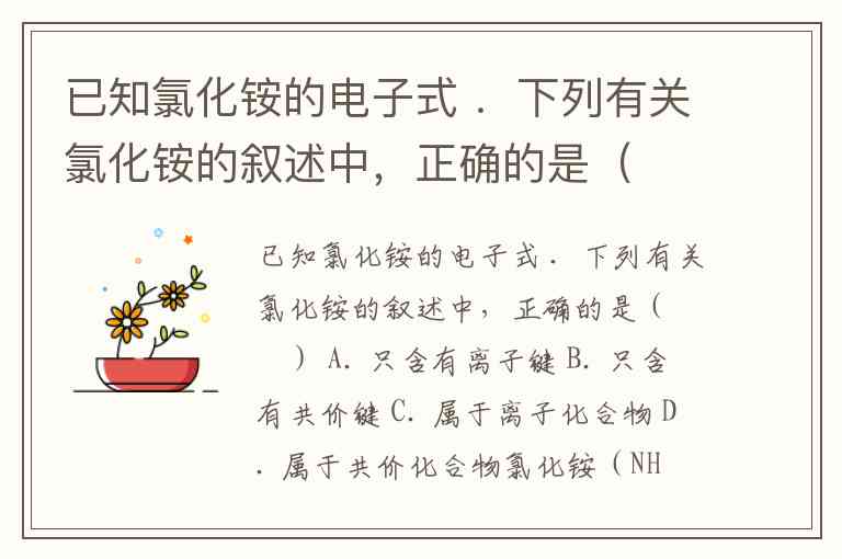 已知氯化铵的电子式 .下列有关氯化铵的叙述中,正确的是( ) A. 只含有离子键 B. 只含有共价键 C. 属于离子化合物 D. 属于共价化合物