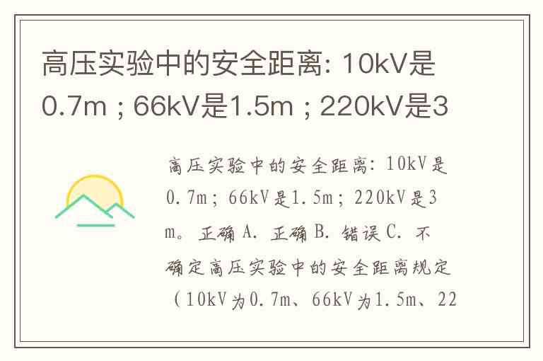 高压实验中的安全距离: 10kV是0.7m ; 66kV是1.5m ; 220kV是3m。正确 A. 正确 B. 错误 C. 不确定