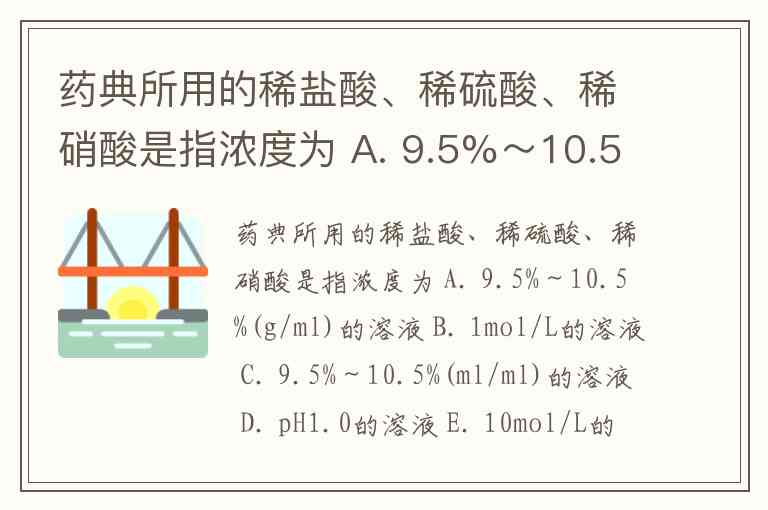 药典所用的稀盐酸、稀硫酸、稀硝酸是指浓度为 A. 9.5%~10.5%(g/ml)的溶液 B. 1mol/L的溶液 C. 9.5%~10.5%(ml/ml)的溶液 D. pH1.0的溶液 E. 10mol/L的溶液