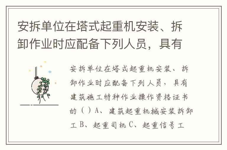 安拆单位在塔式起重机安装、拆卸作业时应配备下列人员,具有建筑施工特种作业操作资格证书的()A、建筑起重机械安装拆卸工 B、起重司机 C、起重信号工 D、司索工 E、检验工