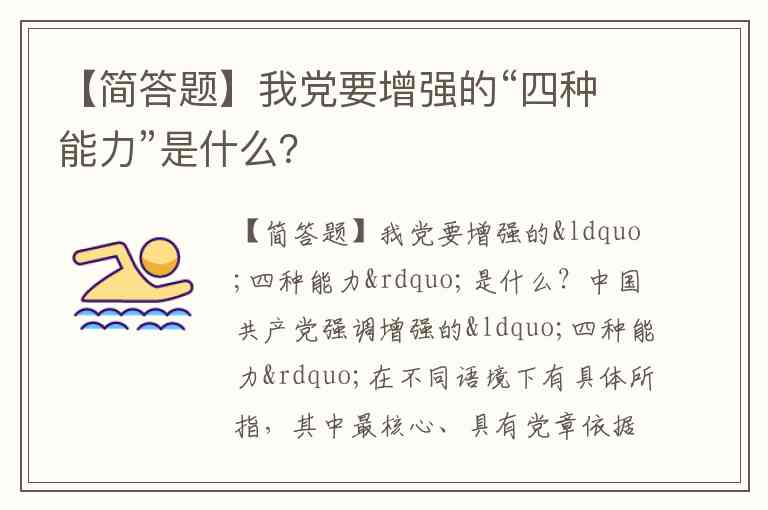 中国共产党强调增强的“四种能力”在不同语境下有具体所指,其中最核心、具有党章依据的是“四自能力”——自我净化、自我完善、自我革新、自我提高能力。这一表述在党的十九大党章修正案中被增写入党的建设总体要求,是党作为马克思主义执政党勇于自我革命的独特品质体现。