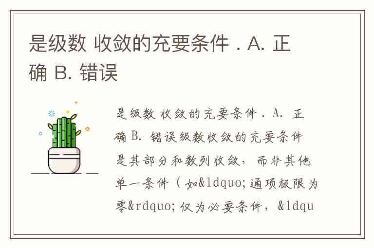 级数收敛的充要条件是其部分和数列收敛,而非其他单一条件(如“通项极限为零”仅为必要条件,“部分和有界”对非正项级数也不充分)。常见的错误表述(如将必要条件误作充要条件)均不成立。