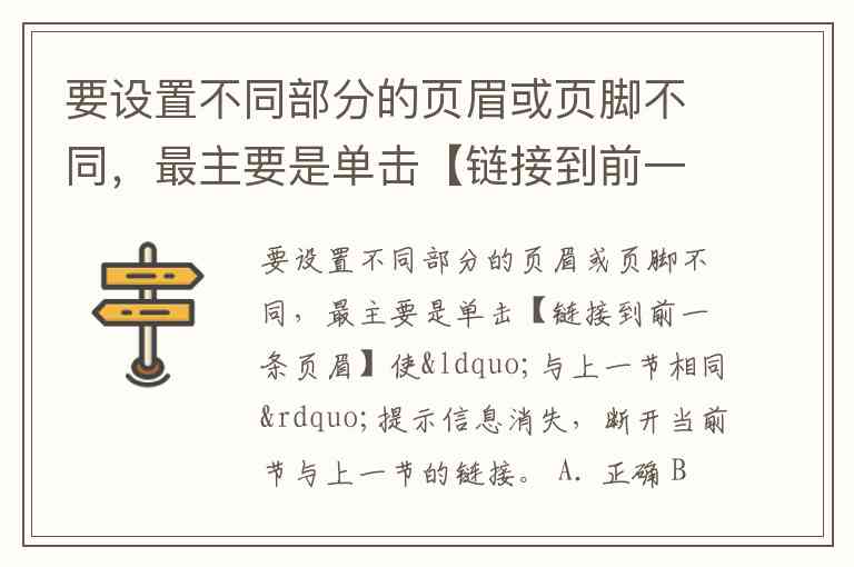 要设置不同部分的页眉或页脚不同,最主要是单击【链接到前一条页眉】使“与上一节相同”提示信息消失,断开当前节与上一节的链接。 A. 正确 B. 错误