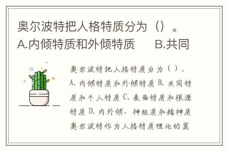 奥尔波特把人格特质分为()。A.内倾特质和外倾特质 B.共同特质和个人特质 C.表面特质和根源特质 D.内外倾、神经质和精神质
