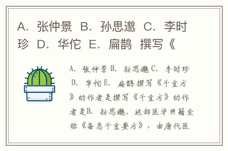 A.张仲景 B.孙思邈 C.李时珍 D.华佗 E.扁鹊 撰写《千金方》的作者是