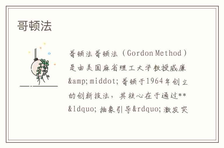 哥顿法(Gordon Method)是由美国麻省理工大学教授威廉·哥顿于1964年创立的创新技法,其核心在于通过**“抽象引导”激发突破性思维**:主持人不直接公布真实问题,而是提出抽象的功能主题(如“分离”“烧制”),引导参与者自由联想,待讨论深入后再揭示真实议题。这种“变熟悉为陌生”的策略,能有效打破思维定势,特别适合产品创新、工艺改进等需要跳出传统框架的场景。