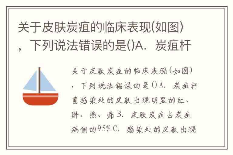 关于皮肤炭疽的临床表现(如图),下列说法错误的是()A.炭疽杆菌感染处的皮肤出现明显的红、肿、热、痛 B.皮肤炭疽占炭疽病例的95% C.感染处的皮肤出现丘疹,数日后出现血性水疱,水疱破溃后形成溃疡,1周左右溃疡面结黑色痂 D.感染处组织可出现恶性水肿 E.重症病例可发展为败血症