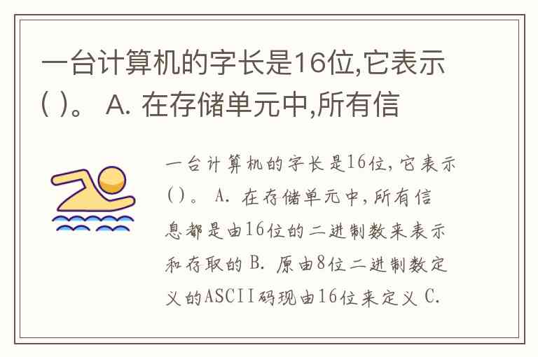 一台计算机的字长是16位,它表示( )。 A. 在存储单元中,所有信息都是由16位的二进制数来表示和存取的 B. 原由8位二进制数定义的ASCII码现由16位来定义 C. 原信息由二进制数存储的,现由十六进制数存储 D. 该计算机能处理的最大字符串是"16位”