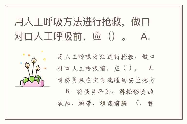 用人工呼吸方法进行抢救,做口对口人工呼吸前,应()。A.将伤员放在空气流通的安全地方 B.将伤员平卧,解松伤员的衣扣、裤带、裸露前胸 C.将伤员的头侧过,清除伤员口中异物