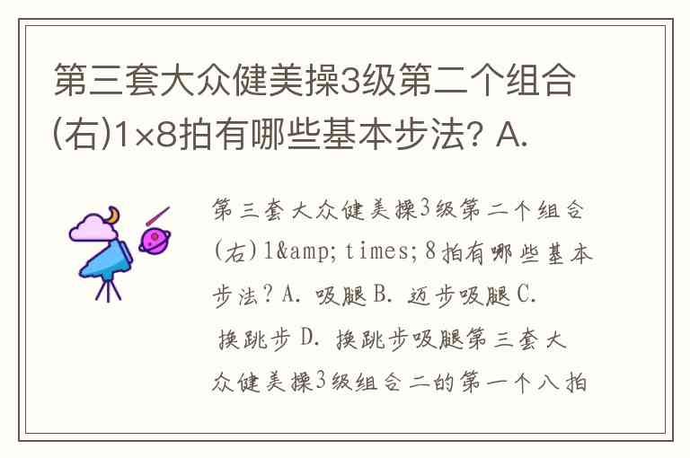第三套大众健美操3级第二个组合(右)1×8拍有哪些基本步法? A. 吸腿 B. 迈步吸腿 C. 换跳步 D. 换跳步吸腿