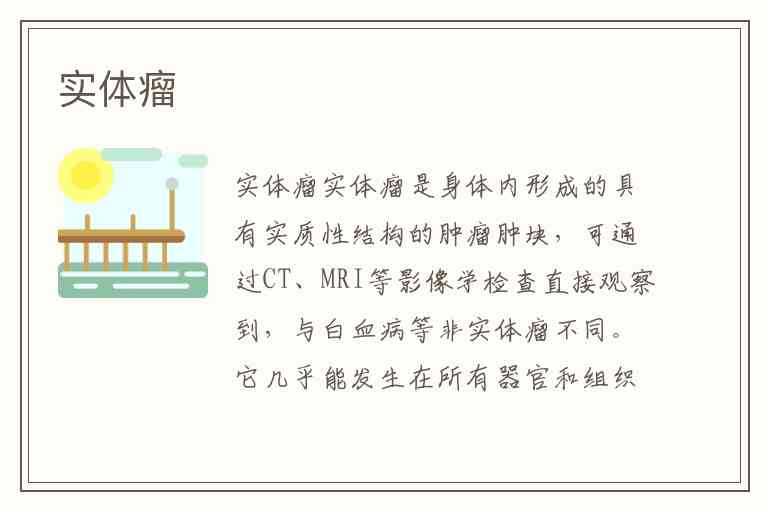 实体瘤是身体内形成的具有实质性结构的肿瘤肿块,可通过CT、MRI等影像学检查直接观察到,与白血病等非实体瘤不同。它几乎能发生在所有器官和组织,从常见的肺癌、乳腺癌到罕见的儿童神经母细胞瘤,影响着各年龄段人群。2025年最新研究显示,80%的恶性实体瘤存在PRL3靶点,这一发现正在改变癌症治疗格局。
