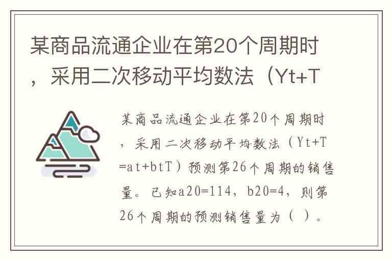 某商品流通企业在第20个周期时,采用二次移动平均数法(Yt+T=at+btT)预测第26个周期的销售量。已知a20=114,b20=4,则第26个周期的预测销售量为( )。 A. 106 B. 124 C. 128 D. 138