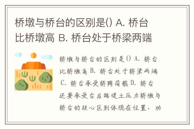 桥墩与桥台的核心区别体现在位置、功能和受力特性三方面。桥台位于桥梁两端,不仅支撑桥跨结构,还需承受台后路堤的水平土压力;桥墩则处于桥梁中间,主要承担垂直荷载。正确答案为B和D。