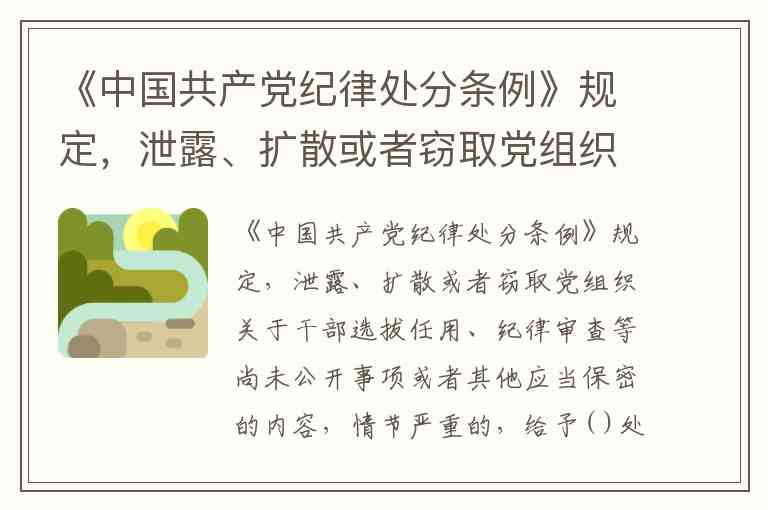 《中国共产党纪律处分条例》对泄露党组织保密内容的行为规定了明确的处分梯度。根据条例第一百四十四条,泄露、扩散或窃取干部选拔任用、纪律审查等尚未公开事项的行为,将根据情节轻重面临不同处分:情节严重的,给予开除党籍处分。这一规定体现了党中央对维护党内保密纪律的坚决态度,从制度层面筑牢了防止"跑风漏气"的纪律防线。
