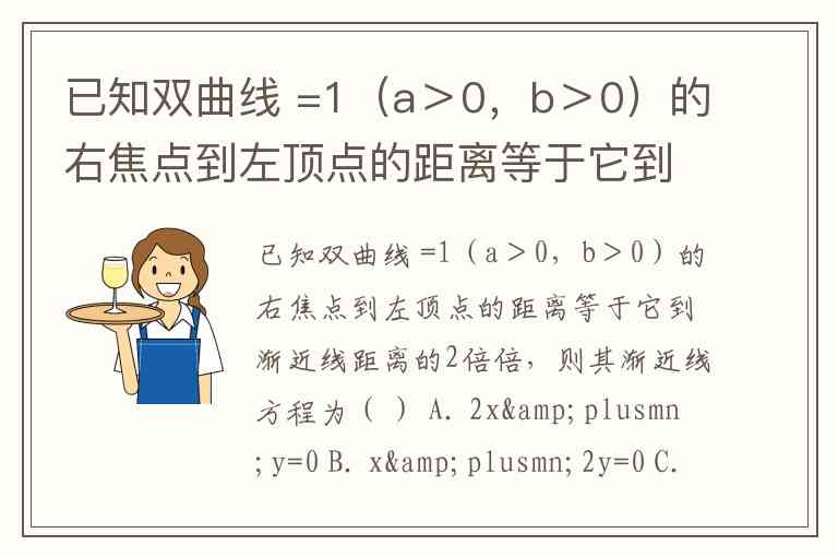 双曲线右焦点到左顶点的距离与到渐近线距离的2倍关系,可通过几何性质建立等式求解渐近线方程。对于焦点在x轴的双曲线(),右焦点为,左顶点为,右焦点到左顶点距离为;焦点到渐近线的距离为(由点到直线距离公式及推导得出)。