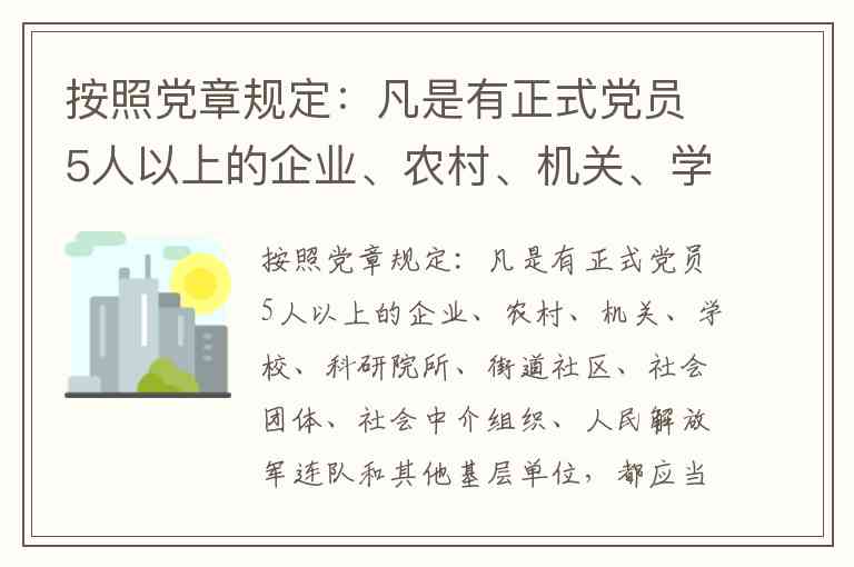根据党章第三十条规定,企业、农村、机关等基层单位成立党的基层组织的条件是正式党员三人以上,而非题目中提到的"5人以上"。这一规定体现了党的组织建设向基层延伸的原则——即使是小型单位,只要党员数量达到3人,就应当建立党组织以发挥战斗堡垒作用。