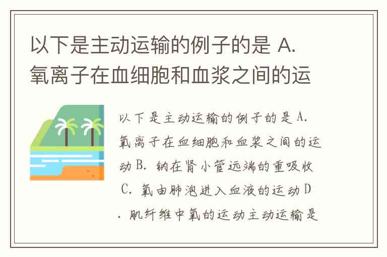 以下是主动运输的例子的是 A. 氧离子在血细胞和血浆之间的运动 B. 钠在肾小管远端的重吸收 C. 氧由肺泡进入血液的运动 D. 肌纤维中氧的运动