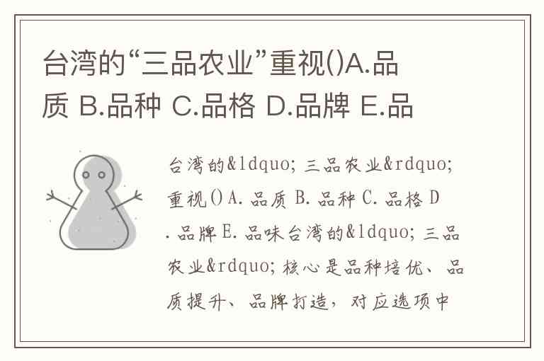 台湾的“三品农业”重视()A.品质 B.品种 C.品格 D.品牌 E.品味