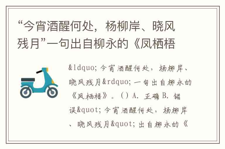 “今宵酒醒何处,杨柳岸、晓风残月”一句出自柳永的《凤栖梧》。( ) A. 正确 B. 错误
