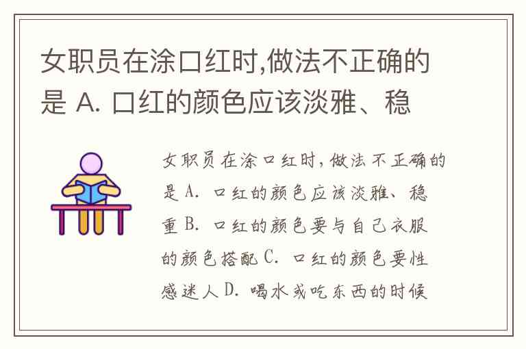 女职员在涂口红时,做法不正确的是 A. 口红的颜色应该淡雅、稳重 B. 口红的颜色要与自己衣服的颜色搭配 C. 口红的颜色要性感迷人 D. 喝水或吃东西的时候,应该拭去唇妆