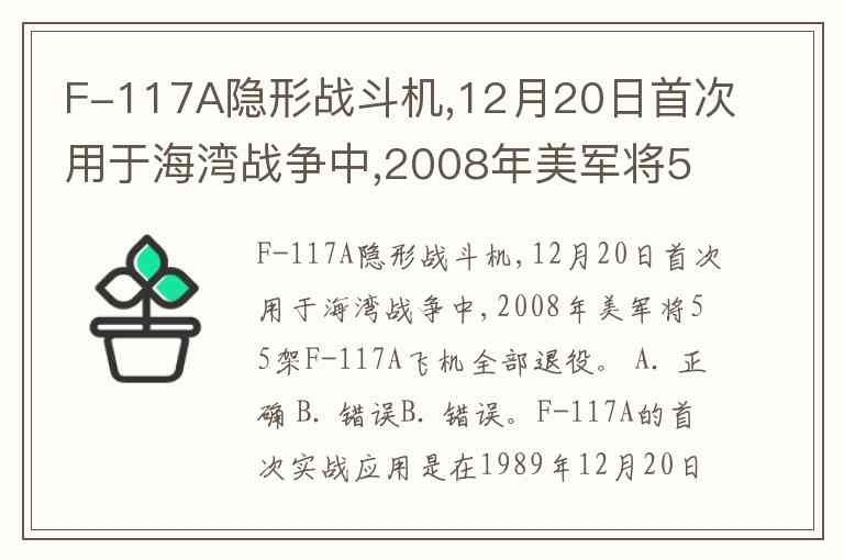 F-117A隐形战斗机,12月20日首次用于海湾战争中,2008年美军将55架F-117A飞机全部退役。 A. 正确 B. 错误