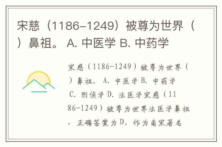 宋慈(1186-1249)被尊为世界()鼻祖。 A. 中医学 B. 中药学 C. 刑侦学 D. 法医学