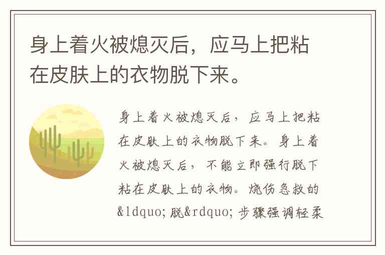 身上着火被熄灭后,应马上把粘在皮肤上的衣物脱下来。