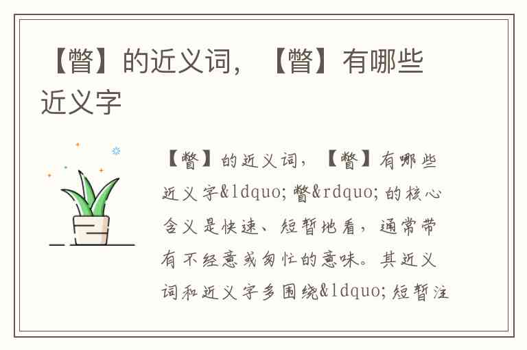 “瞥”的核心含义是快速、短暂地看,通常带有不经意或匆忙的意味。其近义词和近义字多围绕“短暂注视”这一核心特征展开,部分还带有特定的情感色彩或视角特点。