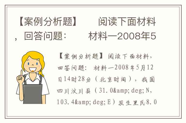 【案例分析题】 阅读下面材料,回答问题: 材料一2008年5月12日14时28分(北京时间),我国四川汶川县(31.0°N,103.4°E)发生里氏8.0级地震,震源深度为10千米~20千米,破坏性巨大。 材料二图为地球内部圈层示意图 地幔属于()态。(固态还是液态)A.左右摇晃 B.上下颠簸 C.先左右摇晃,后上下颠簸 D.先上下颠簸,后左右摇晃