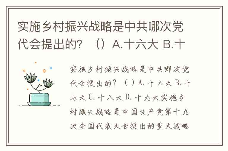 实施乡村振兴战略是中共哪次党代会提出的?()A.十六大 B.十七大 C.十八大 D.十九大