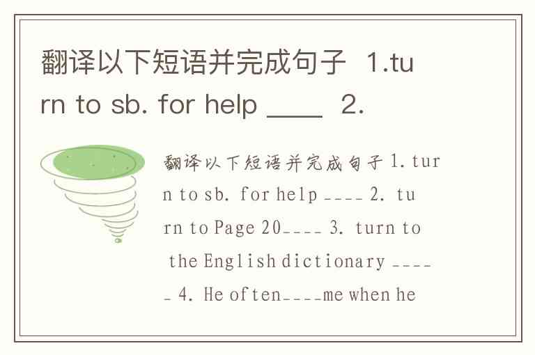 翻译以下短语并完成句子 1.turn to sb. for help ____ 2. turn to Page 20____ 3. turn to the English dictionary _____ 4. He often____me when he is in trouble. 当他遇上麻烦时常常向我求助. 5. After he left the university he became a teacher, but later ____ joumalism 大学毕业后,他当了老师,但后来转向了新闻业. 6. Their talk____the change that had taken place inthe city. 他们的话题转到城市发生的变化.