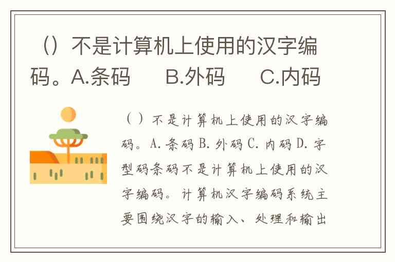 ()不是计算机上使用的汉字编码。A.条码 B.外码 C.内码 D.字型码
