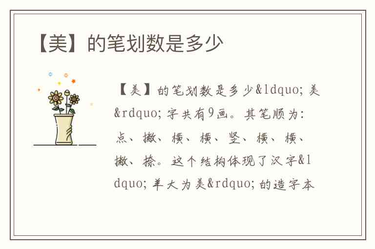 “美”字共有9画。其笔顺为:点、撇、横、横、竖、横、横、撇、捺。这个结构体现了汉字“羊大为美”的造字本义,上部为“羊”(6画),下部为“大”(3画),组合后形成表示美好、漂亮的含义。