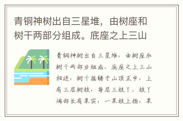 青铜神树出自三星堆,由树座和树干两部分组成。底座之上三山相连,树干接铸于山顶正中,上有三层树枝,每层三枝丫。枝丫端部长有果实,一果枝上扬,果上站立一鸟,两果枝下垂。在树桠和果托下分别铸有火轮。在树的一侧,有一条龙援树而下,龙身呈辫索状马面头,剑状羽翅。从造型来看,该青铜神树应是代表东方的神木