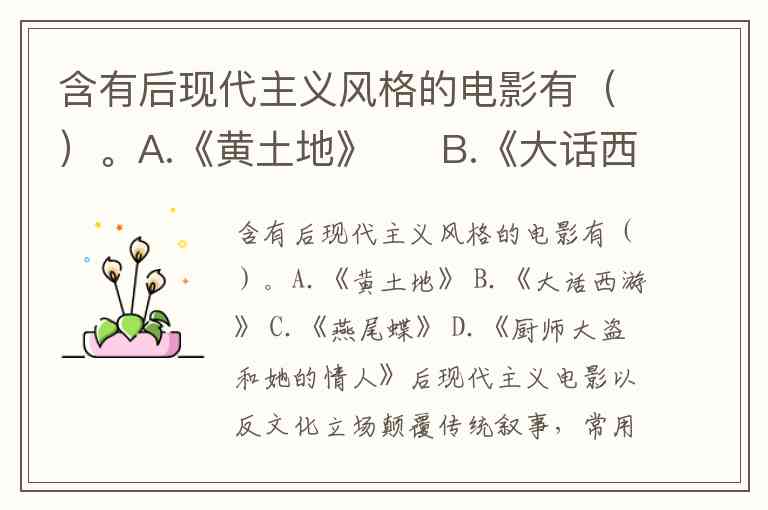 含有后现代主义风格的电影有()。A.《黄土地》 B.《大话西游》 C.《燕尾蝶》 D.《厨师大盗和她的情人》