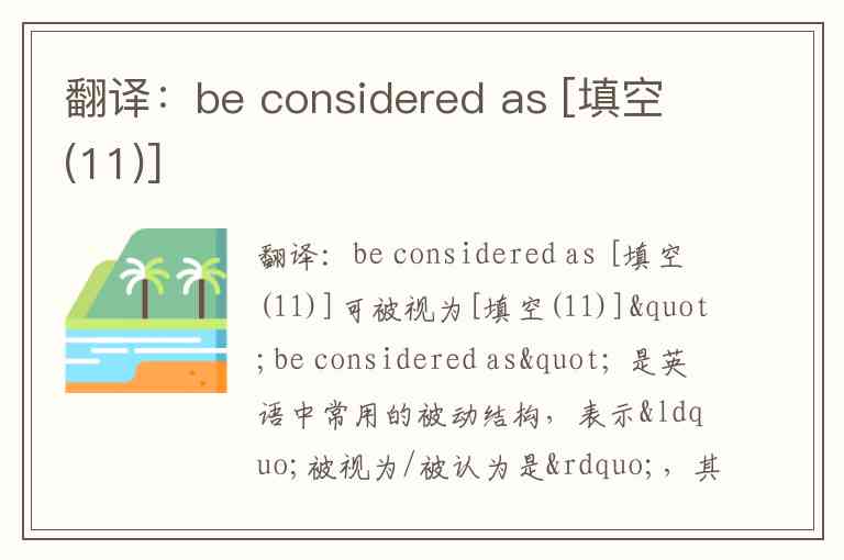 "be considered as" 是英语中常用的被动结构,表示“被视为/被认为是”,其后通常接名词或名词性短语,如 "be considered as a pioneer"(被视为先驱)或 "be considered as an effective solution"(被认为是有效解决方案)。具体含义需根据上下文确定填入的内容。
