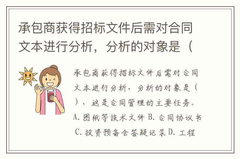 承包商获得招标文件后需对合同文本进行分析,分析的对象是(),这是合同管理的主要任务。A.图纸等技术文件 B.合同协议书 C.投资预备会答疑记录 D.工程量清单 E.合同条款