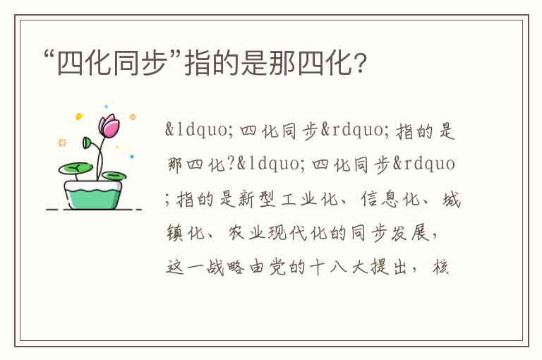“四化同步”指的是新型工业化、信息化、城镇化、农业现代化的同步发展,这一战略由党的十八大提出,核心在于通过“四化”之间的深度互动与系统协调,推动中国经济社会转型与现代化进程。与早期“工业化、农业现代化、国防现代化、科学技术现代化”的“老四化”不同,“新四化”更强调信息技术革命背景下的协同演进,突出“新型”与“同步”两大特征——前者体现发展模式的升级,后者强调避免传统发展中城乡、工农失衡的老路。