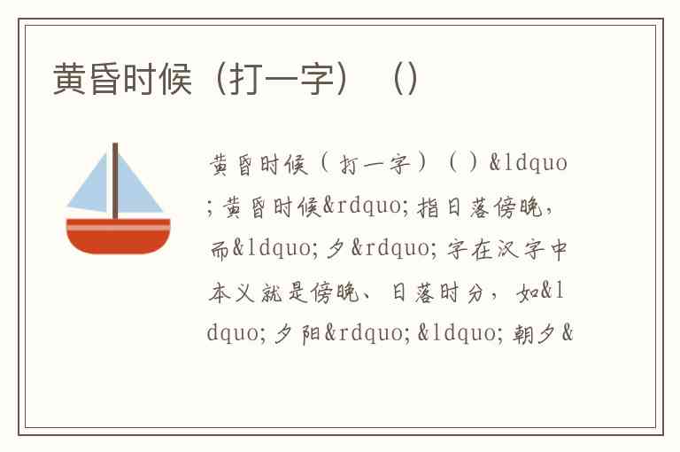 “黄昏时候”指日落傍晚,而“夕”字在汉字中本义就是傍晚、日落时分,如“夕阳”“朝夕”中的“夕”均表此义。这个字谜通过描述时间特征,直接指向代表傍晚的单字。