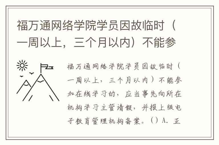 福万通网络学院学员因故临时(一周以上,三个月以内)不能参加在线学习的,应当事先向所在机构学习主管请假,并报上级电子教育管理机构备案。( ) A. 正确 B. 错误