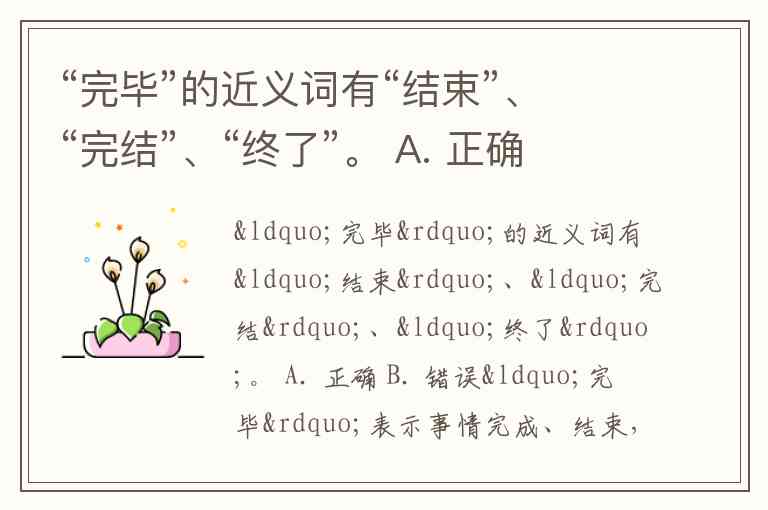 “完毕”表示事情完成、结束,其近义词包括“结束”“完结”“终了”等。“结束”强调发展或进行到最后阶段不再继续;“完结”侧重事情全部完成不留剩余;“终了”则更书面化,指最终的了结。这三个词均与“完毕”在语义和用法上高度接近。答案为A.正确。语言中丰富的近义表达,既体现了汉语的精密性,也为表达不同语境下的细微差别提供了可能,你还能想到哪些与“完毕”近义的词语呢?
