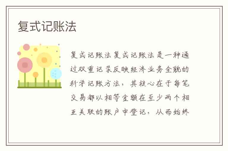 复式记账法是一种通过双重记录反映经济业务全貌的科学记账方法,其核心在于每笔交易都以相等金额在至少两个相互关联的账户中登记,从而始终保持“资产=负债+所有者权益”的会计恒等式平衡。这种方法起源于13世纪意大利的商业城市,经过佛罗伦萨式(萌芽阶段)、热那亚式(改良阶段)和威尼斯式(完备阶段)三个发展时期,最终由卢卡·帕乔利在1494年的《算术、几何、比及比例概要》中系统阐述,标志着现代会计的开端。而在中国,明代的“三脚帐”、明末清初的“龙门帐”和清代的“四脚帐”也独立发展出复式记账思想,其中“四脚帐”已具备完整的复式记录特征,是古代中式簿记的巅峰。