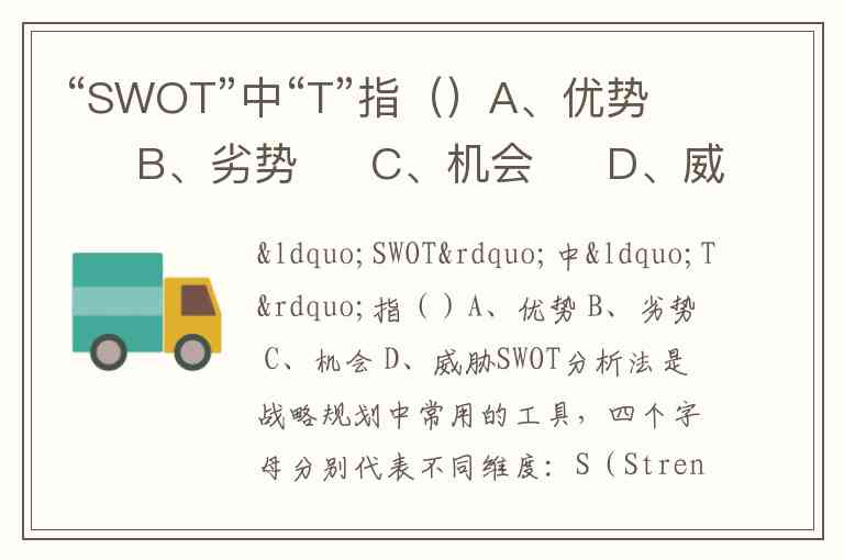 SWOT分析法是战略规划中常用的工具,四个字母分别代表不同维度:S(Strengths,优势)、W(Weaknesses,劣势)、O(Opportunities,机会)、T(Threats,威胁)。其中“T”对应的是外部环境中可能对主体构成挑战的负面因素,如市场竞争加剧、政策变化或技术迭代风险等。