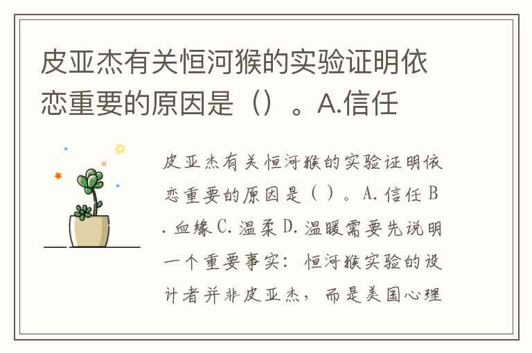 皮亚杰有关恒河猴的实验证明依恋重要的原因是()。A.信任 B.血缘 C.温柔 D.温暖